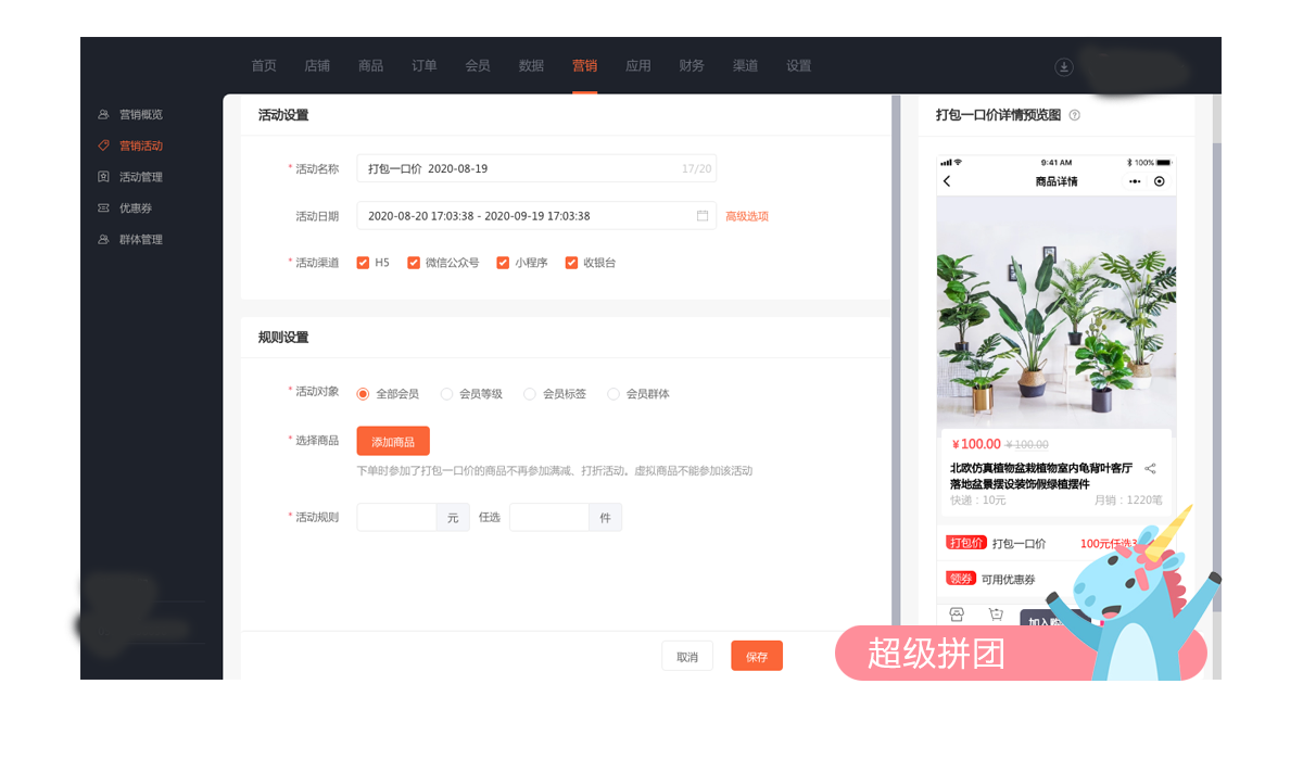 唤回老会员参与商城拼团活动,通过拼团超低价格吸引老用户参与带动新用户加入,促进订单达成,提升成交率