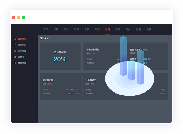 活动参与率、参与人数、奖励发放情况,活动前后会员、销额、订单对比分析一目了然,为您提供精细化用户运营数据基础
