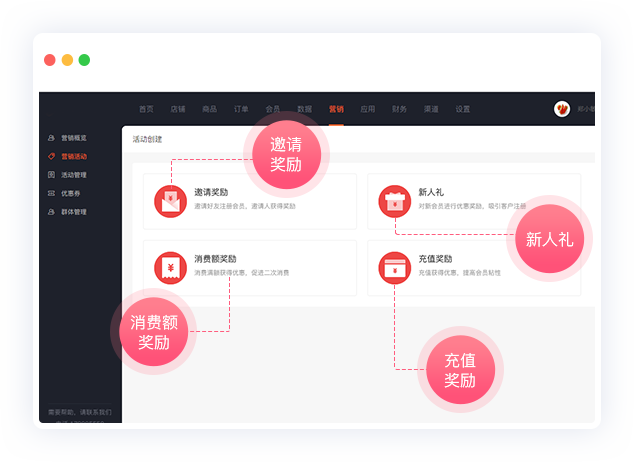邀请奖励,新人礼,消费奖励,充值奖励,满足商城不同运营需求,助力商城拉新、促活、消费、留存、充值