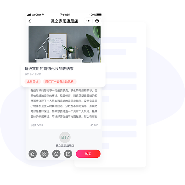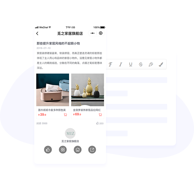 创作爆款及新品营销文章,搭配丰富组件灵活介绍商品亮点,展示商品独特价值,增加用户购买欲望。文章中可嵌套商品,用户直接点击购买促进转化实现销售
