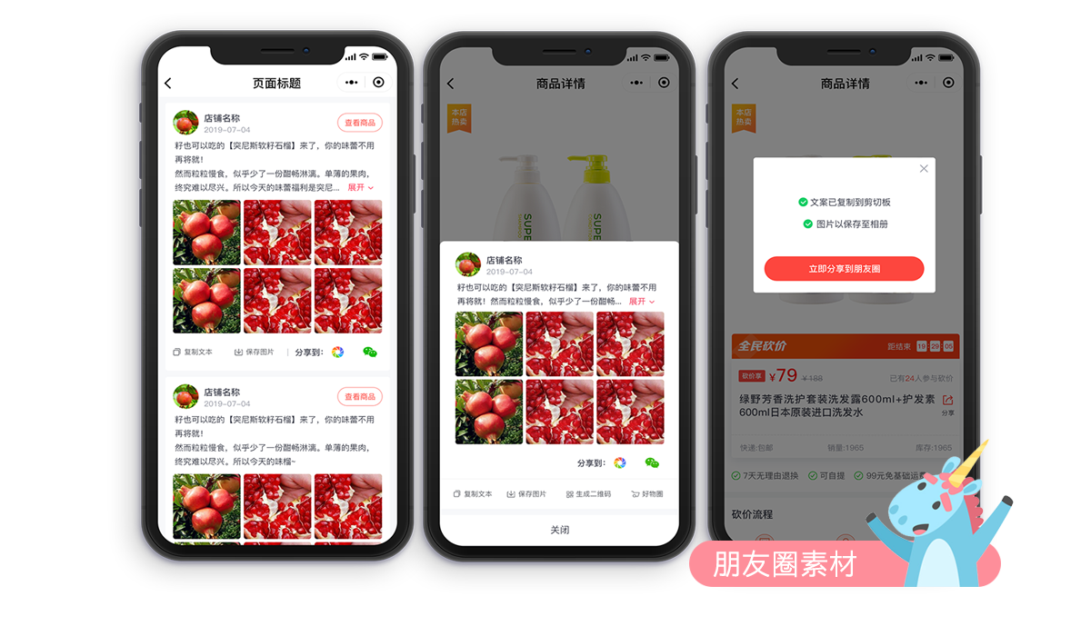 文案一键复制,图片一键保存,便于分销商用最简单便捷的方式轻松发圈,低成本高效率获取流量